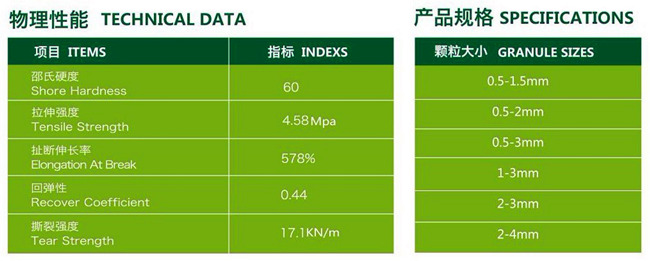 7、 場地厚度要求,一般分兩次施工,以13mm為例:一般底層8mm橡膠顆粒和面層5mmEPDM顆粒。