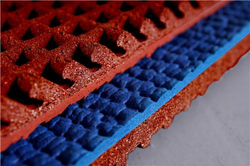 預制型橡膠跑道系列是一種雙層一體結構的環保型橡膠卷材,上層為高韌性耐磨面層,面層深度為1-2mm的無規則花紋是由特制的專業設備連續壓延而成,保證為運動員提供足夠的足底摩擦力。下層為高彈性底層,底層為具有合理傾斜角度的水滴狀蜂巢結構的微孔發泡層。這種幾何結構能夠很好地配合微孔發泡的精密配方,能提供卓越的沖擊吸收能力、平滑的能量過渡以及連續的能量反饋。彈性底層進行惰性氣體閉孔發泡后,形成的眾多微小的惰性氣體氣囊,保證了底層的高回彈性能。