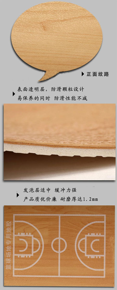 楓木PVC運動地板是仿楓木地板紋路開發的一款產品,專門為籃球場地面而設,鋪裝使用與實木楓木地板無明顯差別,但在價格上更勝一籌,表面采用透明層處理,清潔非常方便,楓木紋發泡均勻、厚度適中,可以有效減少運動跌倒對運動員的傷害。而健身房使用此款地板,簡介大方,由于呈淺色設計,可使光線發射達到最大效果,在空間方面得到視覺加強。