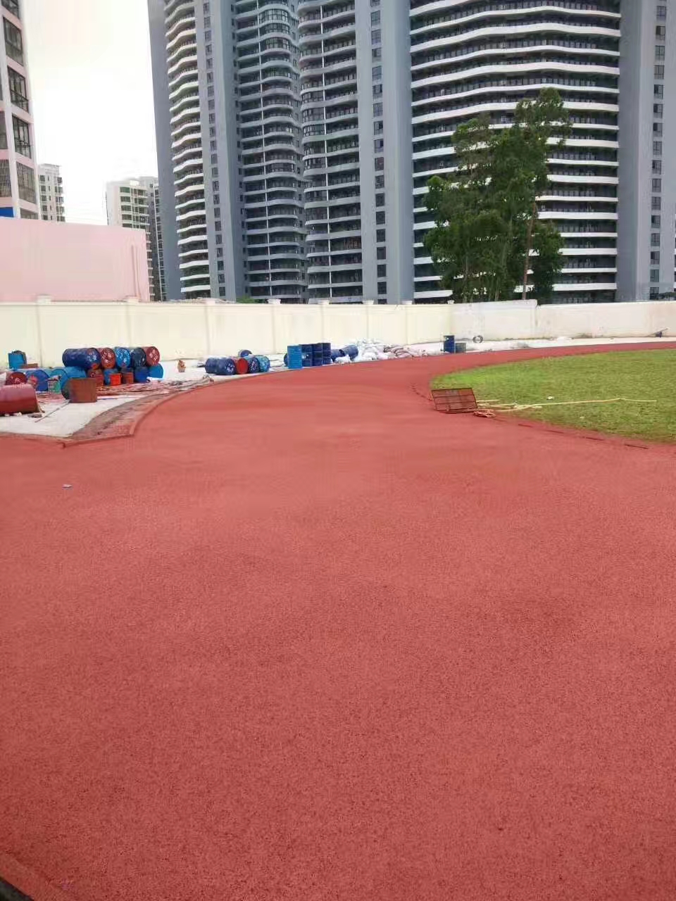 超強抗釘性,適用于各種比賽場地,維護方便經(jīng)濟可吸收強勁沖擊,耐老化,色彩鮮艷。在瀝青基礎(chǔ)上鋪裝最佳。 復(fù)合型顆粒塑膠跑道報價工藝及特點: 檢查基礎(chǔ)平整度,用3m直尺測量平整度需在3mm以內(nèi),全場整體平整。采用粒徑3-4mm高彈性黑膠粒摻高強度單組份膠水,攪拌均勻倒入攤鋪機,鋪設(shè)厚度為9mm,固化保養(yǎng)24小時。用PU膠摻30%黑膠粉或滑石粉進行黑膠粒底層封底,封底保養(yǎng)24小時,全場倒入2mm厚跑道面層材料,刮耙刮平,全場均勻撒下3-5mmEPDM防滑顆粒,24小時后清掃掉未粘牢的EPDM顆粒,之后滾涂或噴涂一層跑道專用面漆。 抗紫外線,有效避免運動傷害,具有強韌的彈性層及緩沖層,可抗釘鞋磨損,軟硬適中,耐磨性佳。在鋼筋混凝土基礎(chǔ)上鋪裝最佳 透氣型顆粒塑膠跑道報價工藝及特點: 檢查基礎(chǔ)平整度,用3m直尺測量平整度需在3mm以內(nèi),全場整體平整,場地排水坡度達到要求。采用粒徑3-4mm高彈性黑膠粒摻高強度單組份膠水,攪拌均勻倒入攤鋪機,鋪設(shè)厚度為10mm,固化保養(yǎng)24小時。用透氣型面層材料摻等量粒徑1-2mmEPDM顆粒及適量稀釋劑攪拌均勻,倒入噴涂機,噴槍傾斜至60度進行同向噴涂,待噴涂完畢保養(yǎng)24小時,相反方向再進行一次噴涂,保養(yǎng)48小時方可使用。 全天候使用,環(huán)保無公害,不褪色,不掉顆粒,透水透氣,采用機械施工,平整度**.在鋼筋混凝土基礎(chǔ)上鋪裝最佳。 透氣型塑膠跑道底層是采用單液型PU與彈性橡膠顆粒相結(jié)合,為綠色環(huán)保型產(chǎn)品具有透氣功能;透氣型塑膠跑道在高溫下,地面產(chǎn)生的蒸汽會很快的散發(fā)出去。蒸汽壓力無法聚集,所以不會產(chǎn)生鼓泡現(xiàn)象,并符合專業(yè)透氣跑道要求,彈性好。 透氣型塑膠跑道施工工藝:①素地處理:依素地狀況做好打磨修補除塵酸洗地面;②攤鋪黑橡膠顆粒:將單組份專用膠水和黑橡膠顆粒混合均勻進行鋪設(shè),修平修齊;③透氣型專用面膠噴涂:厚度為2-3mm,以紅膠粉等填充料攪拌均勻,噴涂在攤鋪好的黑橡膠顆粒層面上;④畫線:選用彈性聚氨酯專用畫線漆,按照國際標(biāo)準(zhǔn)畫出各種標(biāo)示線