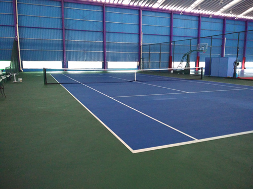 該項目選用優(yōu)質(zhì)丙烯酸面層施工2片丙烯酸網(wǎng)球場;環(huán)保水性硅PU施工2片塑膠籃球場,采用絕對環(huán)保材料,保證了室內(nèi)場地凈味無毒害氣體發(fā)揮;采用實木楓木地板鋪設(shè)了2片標準木地板籃球場,另外14片羽毛球場采用PVC地膠鋪設(shè)。