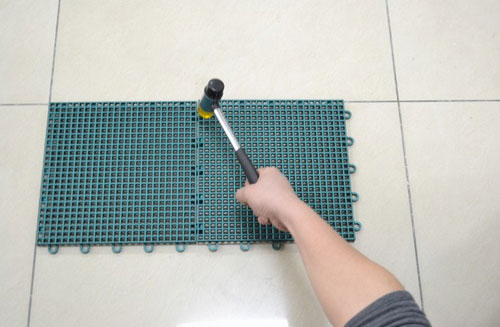 地面基礎(chǔ):在基礎(chǔ)堅(jiān)實(shí)、平整的基礎(chǔ)上均可。3米直尺范圍內(nèi)誤差不超過(guò)5毫米。懸浮式拼裝地板安裝前先將地面清掃干凈;安裝時(shí)請(qǐng)按場(chǎng)地的長(zhǎng)寬用滑石粉彈好 線,以此定位地板的安裝位置,彈線完成后貼上美紋紙,然后用專用油漆進(jìn)行劃線;再依次把銷和孔對(duì)齊后用橡皮錘敲擊地板接縫便可安裝成功。