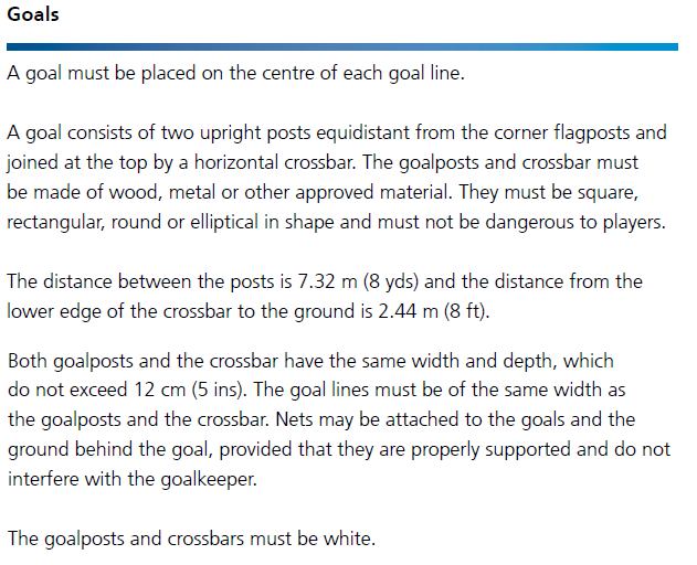 兩根柱子之間的距離是7.32米(8碼),從橫梁的下沿至地面的距離是2.44米(8英尺)。