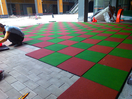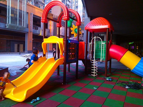 兒童游樂場地面考慮到兒童安全,都必須使用安全地墊,可選橡膠安全地墊或EPDM顆粒地墊。佛山創(chuàng)意產(chǎn)業(yè)園業(yè)主居住活動場區(qū)域采用25mm橡膠地墊鋪設,上面為兒童樂園組合滑梯。