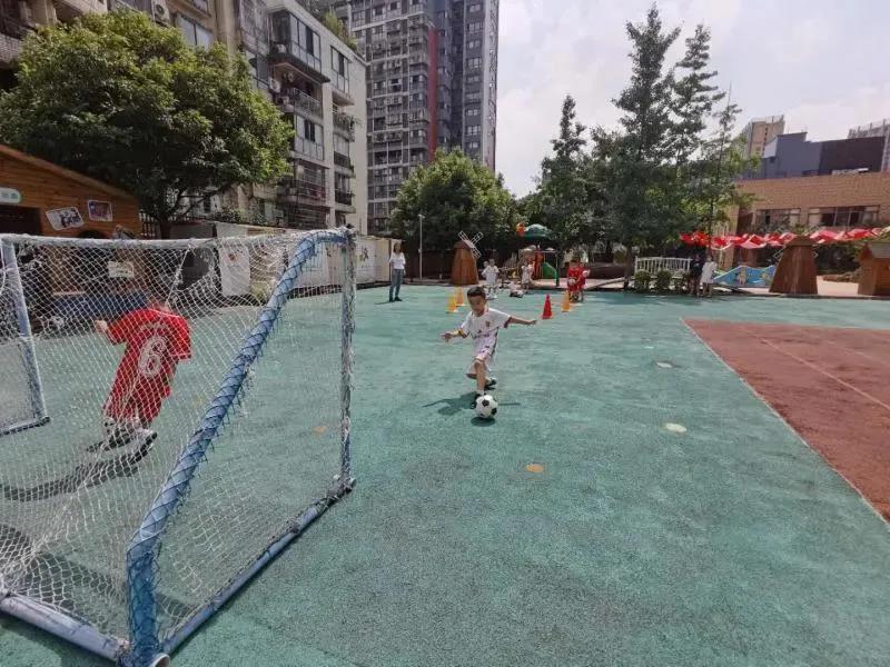 這是成都市第九幼兒園足球游戲現場的景象。陳先蓉園長介紹,在幼兒足球活動中,他們會特意邀請有專業能力的“足球爸爸”參與其中。“我們做幼兒足球的初衷是增強孩子的身體素質和思維能力,沒想到卻有一個意外的收獲,那就是‘讓爸爸歸位’。通過足球,爸爸們能夠更多地陪伴孩子,重新回到親子教育的角色中來。”她說。